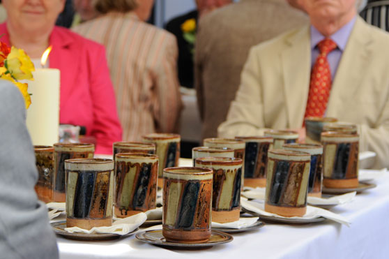 Linkes Bild: Über das Gelingen des Werks und seine begeisterte Aufnahme freuen sich der Künstler und Gestalter Prof. Gottfried Pott, die Autoren Gerlinde Back und Prof. Rudolf Wichard sowie Dietrich Fischer, Geschäftsführer der Druckerei Maring-Fischer.